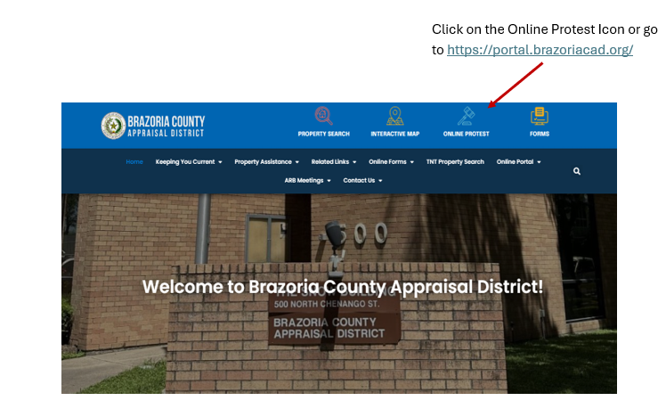 Step 1: Go to Brazoria County Appraisal District Home Page and click on the Online Protest Icon on the top right of our page.
