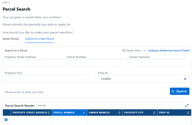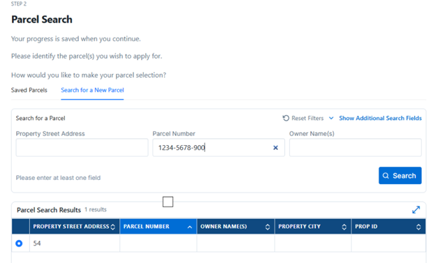 - Navigate to Step 2: Parcel Search on the application page.